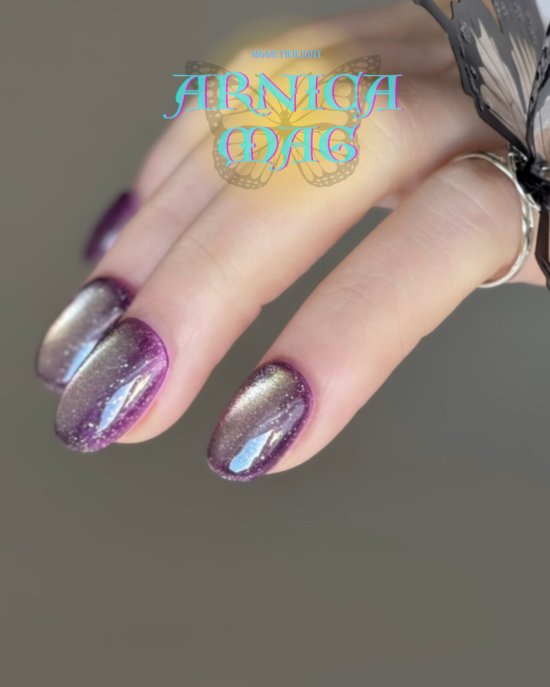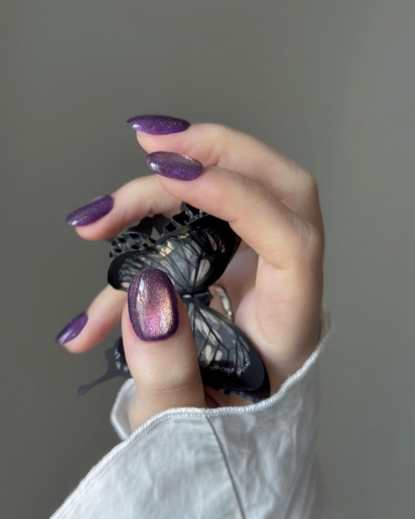 夕暮れから夜へ移ろう瞬間と羽化直前の変化を概念としてくみあわせたような、トワイライトの意味通り「黄」昏に紫が溶け合ったダブルカラー。