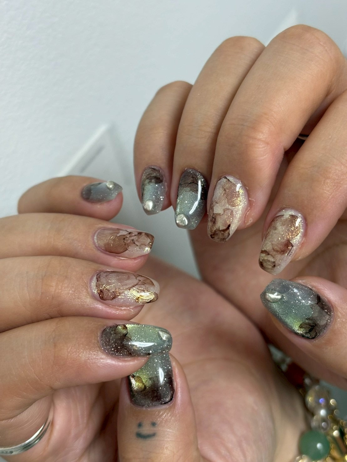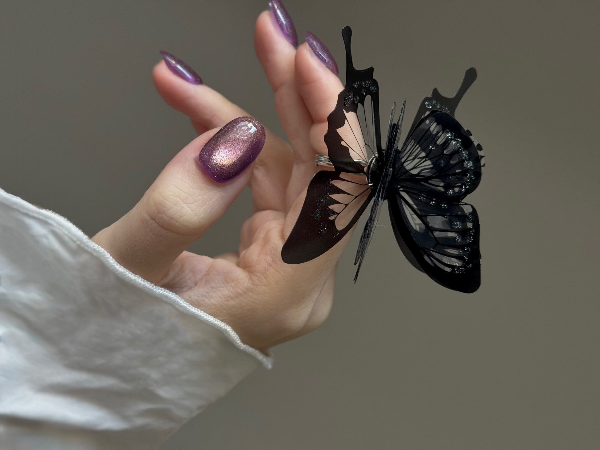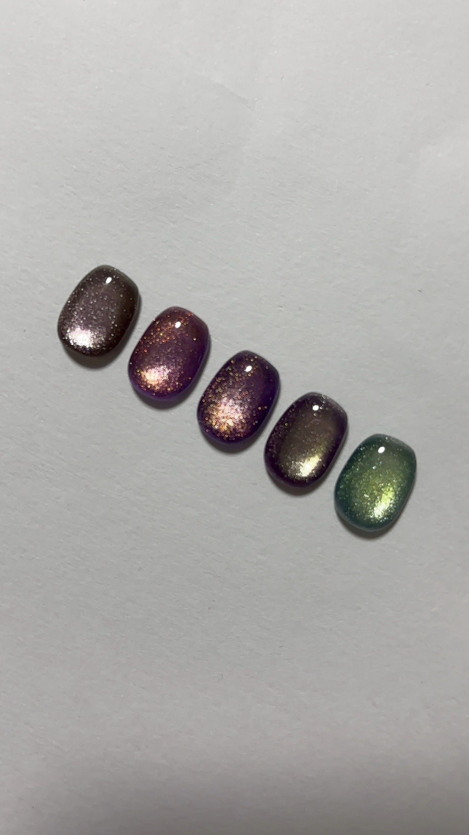 虫の羽を思わせるような怪しさと妖精の光が宿るような、両極端な側面を合わせたフェアリーグリーン。彩度の低いグリーンの奥でライム色の光と主張の強いグリッターが反射し不安定にぎらつく存在感ある色彩です。